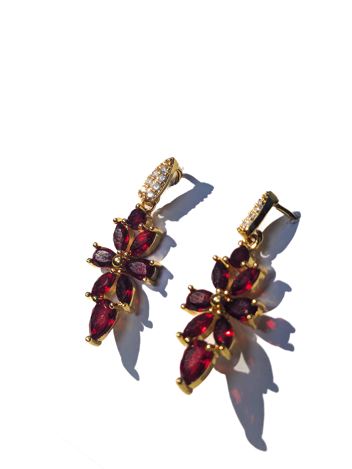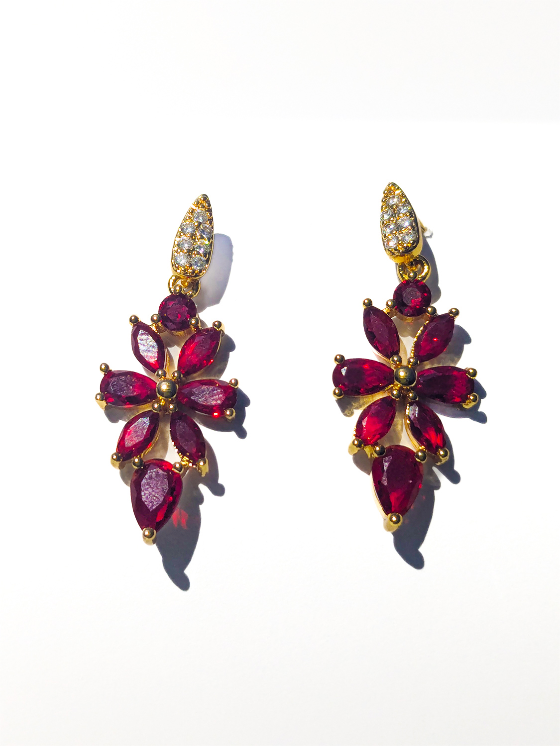 These dramatic red flower drop earrings, set in sustainable gold-tone stainless steel, offer unique design and comfortable, lightweight wear for effortless style.
