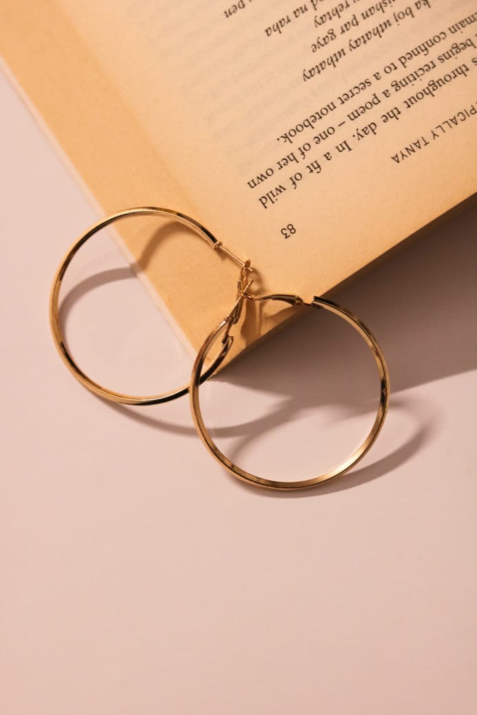 Elegant gold hoop earrings rest on an open book, combining sleek style with timeless literary charm.